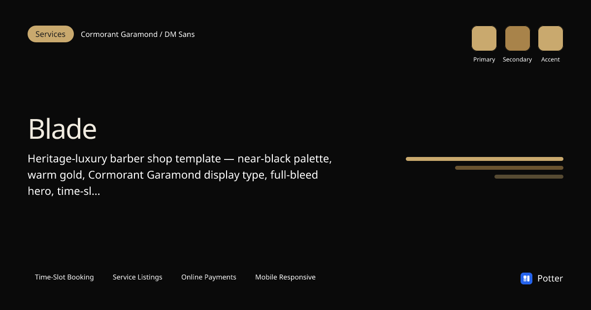 Heritage-luxury barber shop template — near-black palette, warm gold, Cormorant Garamond display type, full-bleed hero, time-slot booking.