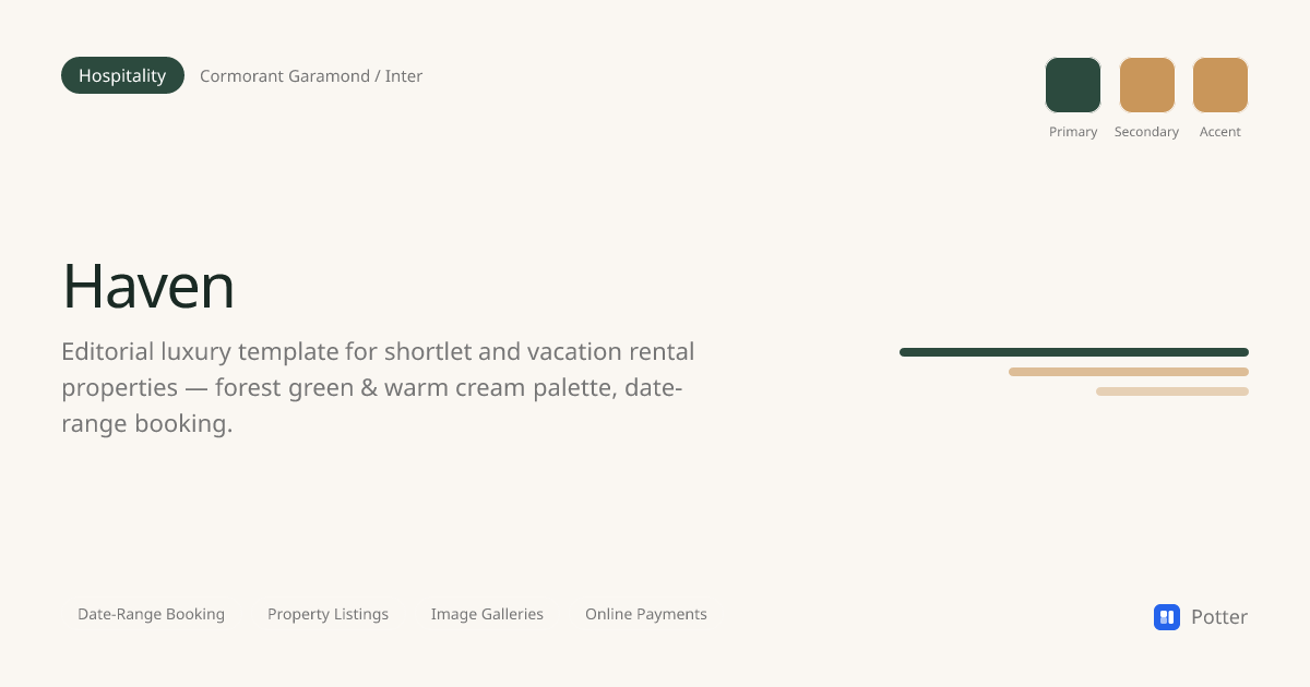Editorial luxury template for shortlet and vacation rental properties — forest green & warm cream palette, date-range booking.