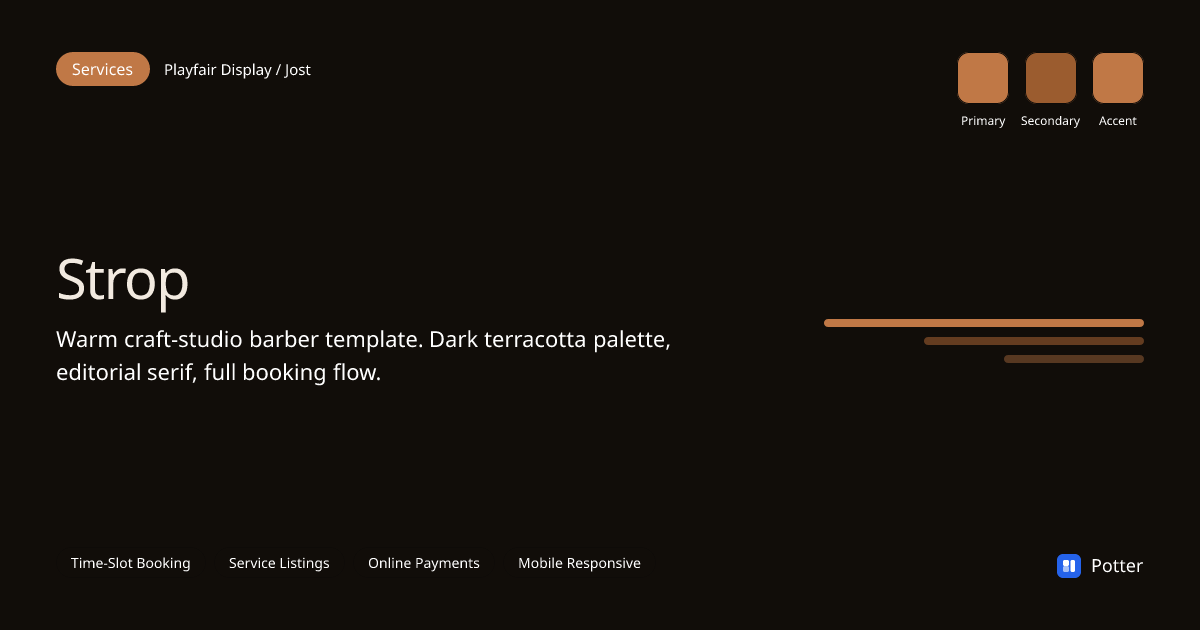 Warm craft-studio barber template. Dark terracotta palette, editorial serif, full booking flow.