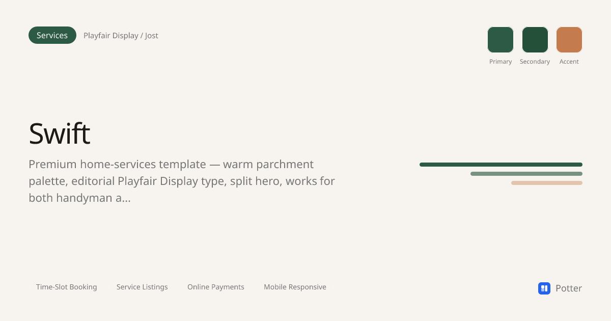 Premium home-services template — warm parchment palette, editorial Playfair Display type, split hero, works for both handyman and cleaning businesses.